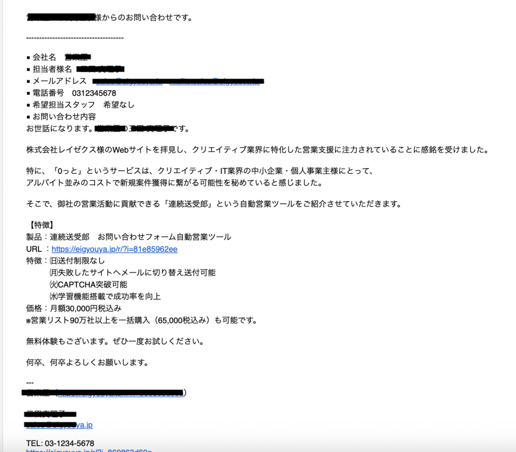 「株式会社レイゼクス様のWebサイトを拝見し、クリエイティブ業界に特化した営業支援に注力されていることに感銘を受けました。特に、「0っと」というサービスは、クリエイティブ・IT業界の中小企業・個人事業主様にとって、アルバイト並みのコストで新規案件獲得に繋がる可能性を秘めていると感じました。」