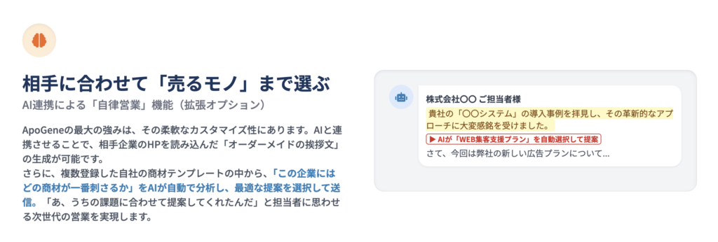 「AIを使った自動営業」とか「AIに全てお任せ!」のような謳い文句でサービスを提供しているケースが多いですね。